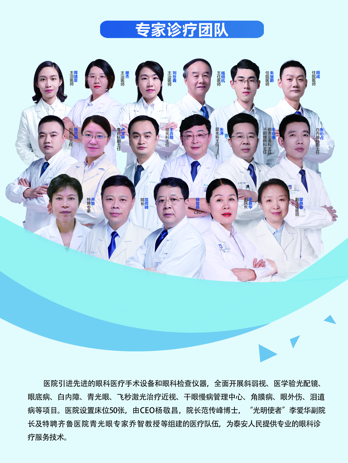 ? ? ?醫院具備良好的人才梯隊建設體系,眼科專家團隊經驗豐富,技術精湛,目前醫院眼科中高級職稱三十余人,眼科業務工作總量位居全市前列。由院長范傳峰博士、“光明使者”李愛華副院長及特聘齊魯醫院青光眼專家喬智教授等組建的醫療隊伍,為泰安人民提供專業的眼科診療服務。